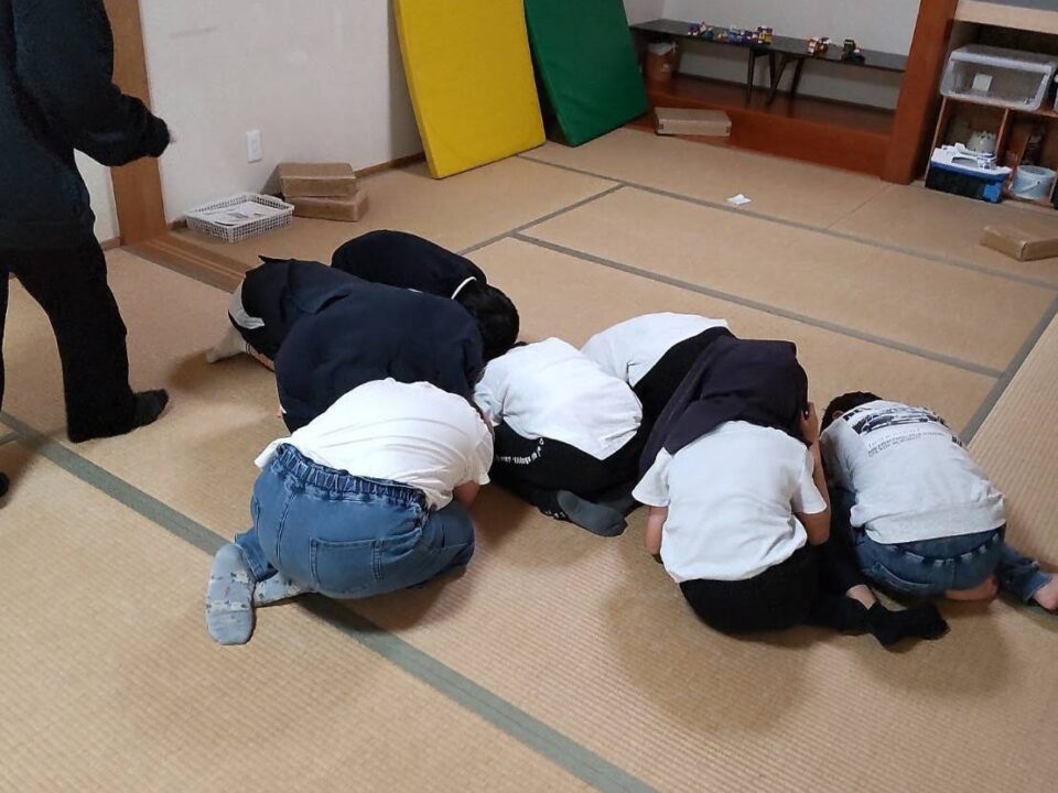 最後に、活動部屋で地震が起こった場合の避難訓練をしました。地震が起こった時の警告音を流すと、とても大きな音で驚いている子もいました。支援員の指示で真ん中に集まり、ダンゴムシのポーズで次の指示があるまで動かず待つことが出来ました!